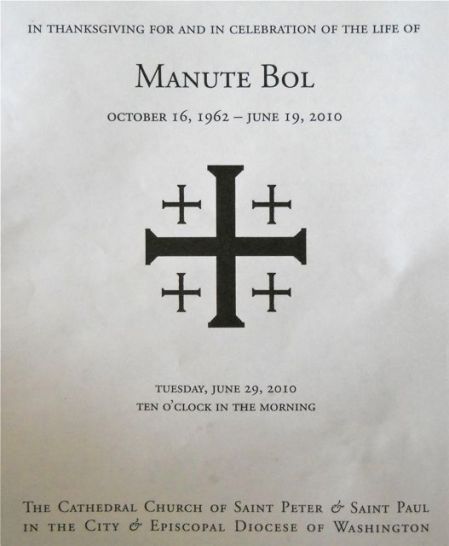 The program from former Washington Bullet Manute Bol’s funeral, July 29, 2010 at the National Cathedral in Washington, D.C.
