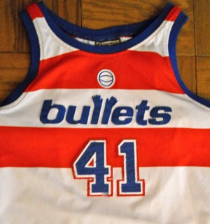 Here’s hoping that the Wizards’ new unis won’t be 99% red like the Caps’ and Nats’ uniforms.  Keep some blue.  Also, add back the stars on the shorts.  The photo to the left shows former Bullet Kevin Grevey in the Bullets’ old road uniforms.  The photo below shows a retro Wes Unseld home uniform.  Both were among the best in the history of the NBA.